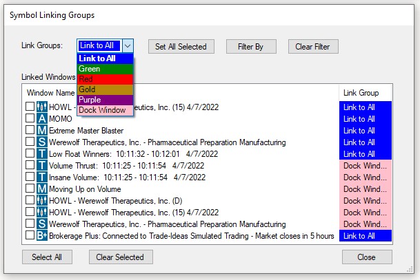 To see all windows that are assigned to a specific Linking Group, choose the Group Color from the Link Groups dropdown, then select, Filter By. To see all available windows, select, Clear Filter.